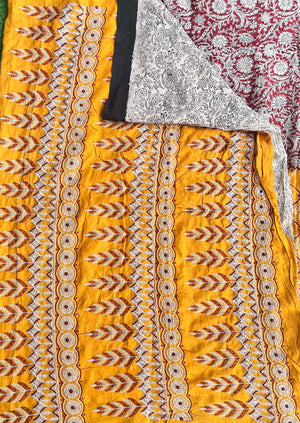 Elevate your style with this exquisite silk saree that beautifully combines the richness of embroidery, the timeless artistry of Kalamkari, and the vibrant charm of tie and dye. Meticulously handcrafted, this masterpiece showcases intricate embroidered details, complemented by authentic Kalamkari designs that narrate cultural stories, while the vibrant tie and dye patterns add a contemporary touch. Perfect for weddings, festive occasions, or special celebrations, this saree is a harmonious blend of tradition and modernity, crafted for the discerning connoisseur of elegance.
