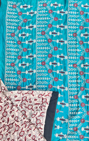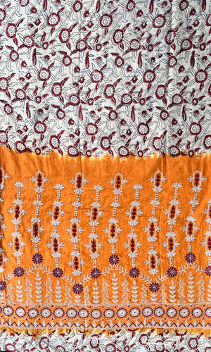 Elevate your style with this exquisite silk saree that beautifully combines the richness of embroidery, the timeless artistry of Kalamkari, and the vibrant charm of tie and dye. Meticulously handcrafted, this masterpiece showcases intricate embroidered details, complemented by authentic Kalamkari designs that narrate cultural stories, while the vibrant tie and dye patterns add a contemporary touch. Perfect for weddings, festive occasions, or special celebrations, this saree is a harmonious blend of tradition and modernity, crafted for the discerning connoisseur of elegance.