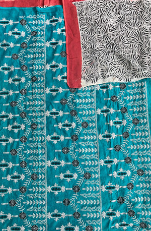 Elevate your style with this exquisite silk saree that beautifully combines the richness of embroidery, the timeless artistry of Kalamkari, and the vibrant charm of tie and dye. Meticulously handcrafted, this masterpiece showcases intricate embroidered details, complemented by authentic Kalamkari designs that narrate cultural stories, while the vibrant tie and dye patterns add a contemporary touch. Perfect for weddings, festive occasions, or special celebrations, this saree is a harmonious blend of tradition and modernity, crafted for the discerning connoisseur of elegance.