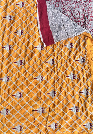 Elevate your style with this exquisite silk saree that beautifully combines the richness of embroidery, the timeless artistry of Kalamkari, and the vibrant charm of tie and dye. Meticulously handcrafted, this masterpiece showcases intricate embroidered details, complemented by authentic Kalamkari designs that narrate cultural stories, while the vibrant tie and dye patterns add a contemporary touch. Perfect for weddings, festive occasions, or special celebrations, this saree is a harmonious blend of tradition and modernity, crafted for the discerning connoisseur of elegance.