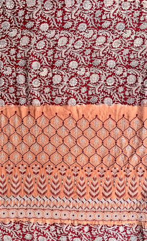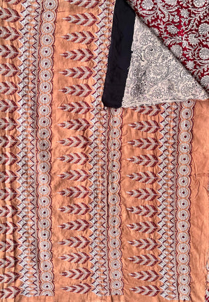Elevate your style with this exquisite silk saree that beautifully combines the richness of embroidery, the timeless artistry of Kalamkari, and the vibrant charm of tie and dye. Meticulously handcrafted, this masterpiece showcases intricate embroidered details, complemented by authentic Kalamkari designs that narrate cultural stories, while the vibrant tie and dye patterns add a contemporary touch. Perfect for weddings, festive occasions, or special celebrations, this saree is a harmonious blend of tradition and modernity, crafted for the discerning connoisseur of elegance.