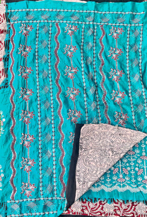 Elevate your style with this exquisite silk saree that beautifully combines the richness of embroidery, the timeless artistry of Kalamkari, and the vibrant charm of tie and dye. Meticulously handcrafted, this masterpiece showcases intricate embroidered details, complemented by authentic Kalamkari designs that narrate cultural stories, while the vibrant tie and dye patterns add a contemporary touch. Perfect for weddings, festive occasions, or special celebrations, this saree is a harmonious blend of tradition and modernity, crafted for the discerning connoisseur of elegance.