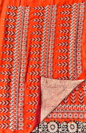 Elevate your style with this exquisite silk saree that beautifully combines the richness of embroidery, the timeless artistry of Kalamkari, and the vibrant charm of tie and dye. Meticulously handcrafted, this masterpiece showcases intricate embroidered details, complemented by authentic Kalamkari designs that narrate cultural stories, while the vibrant tie and dye patterns add a contemporary touch. Perfect for weddings, festive occasions, or special celebrations, this saree is a harmonious blend of tradition and modernity, crafted for the discerning connoisseur of elegance.