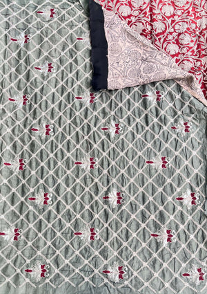 Elevate your style with this exquisite silk saree that beautifully combines the richness of embroidery, the timeless artistry of Kalamkari, and the vibrant charm of tie and dye. Meticulously handcrafted, this masterpiece showcases intricate embroidered details, complemented by authentic Kalamkari designs that narrate cultural stories, while the vibrant tie and dye patterns add a contemporary touch. Perfect for weddings, festive occasions, or special celebrations, this saree is a harmonious blend of tradition and modernity, crafted for the discerning connoisseur of elegance.