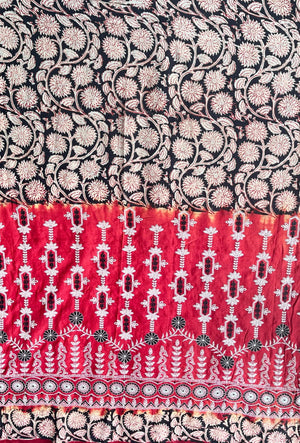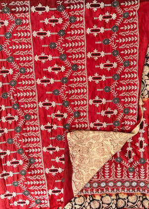 Elevate your style with this exquisite silk saree that beautifully combines the richness of embroidery, the timeless artistry of Kalamkari, and the vibrant charm of tie and dye. Meticulously handcrafted, this masterpiece showcases intricate embroidered details, complemented by authentic Kalamkari designs that narrate cultural stories, while the vibrant tie and dye patterns add a contemporary touch. Perfect for weddings, festive occasions, or special celebrations, this saree is a harmonious blend of tradition and modernity, crafted for the discerning connoisseur of elegance.