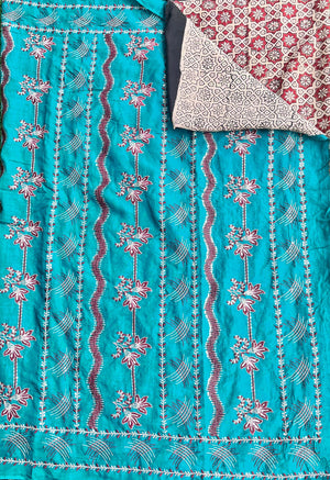 Elevate your style with this exquisite silk saree that beautifully combines the richness of embroidery, the timeless artistry of Kalamkari, and the vibrant charm of tie and dye. Meticulously handcrafted, this masterpiece showcases intricate embroidered details, complemented by authentic Kalamkari designs that narrate cultural stories, while the vibrant tie and dye patterns add a contemporary touch. Perfect for weddings, festive occasions, or special celebrations, this saree is a harmonious blend of tradition and modernity, crafted for the discerning connoisseur of elegance.