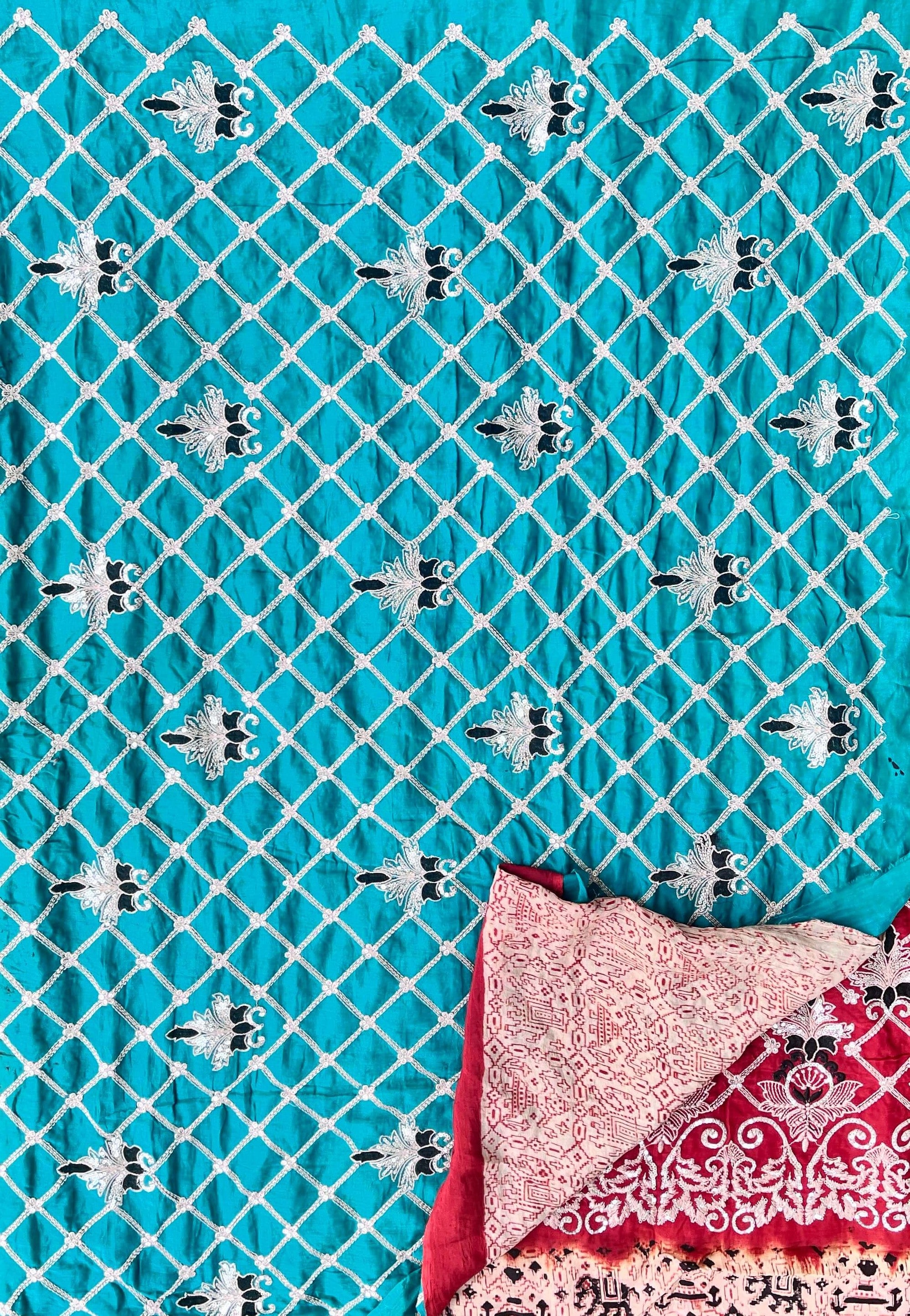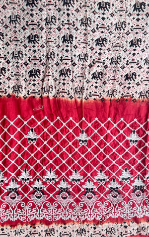 Elevate your style with this exquisite silk saree that beautifully combines the richness of embroidery, the timeless artistry of Kalamkari, and the vibrant charm of tie and dye. Meticulously handcrafted, this masterpiece showcases intricate embroidered details, complemented by authentic Kalamkari designs that narrate cultural stories, while the vibrant tie and dye patterns add a contemporary touch. Perfect for weddings, festive occasions, or special celebrations, this saree is a harmonious blend of tradition and modernity, crafted for the discerning connoisseur of elegance.