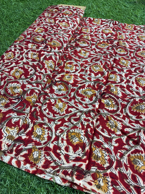 Discover the exquisite artistry of our Kalamkari block-printed, natural dyed Chennuri silk fabric. Kalamkari, one of the earliest and most detailed block-printing techniques, takes center stage in this collection. Each piece showcases captivating hand-blocked motifs inspired by the timeless traditions of Kalamkari painting, reflecting the rich heritage and culture of Andhra Pradesh.
