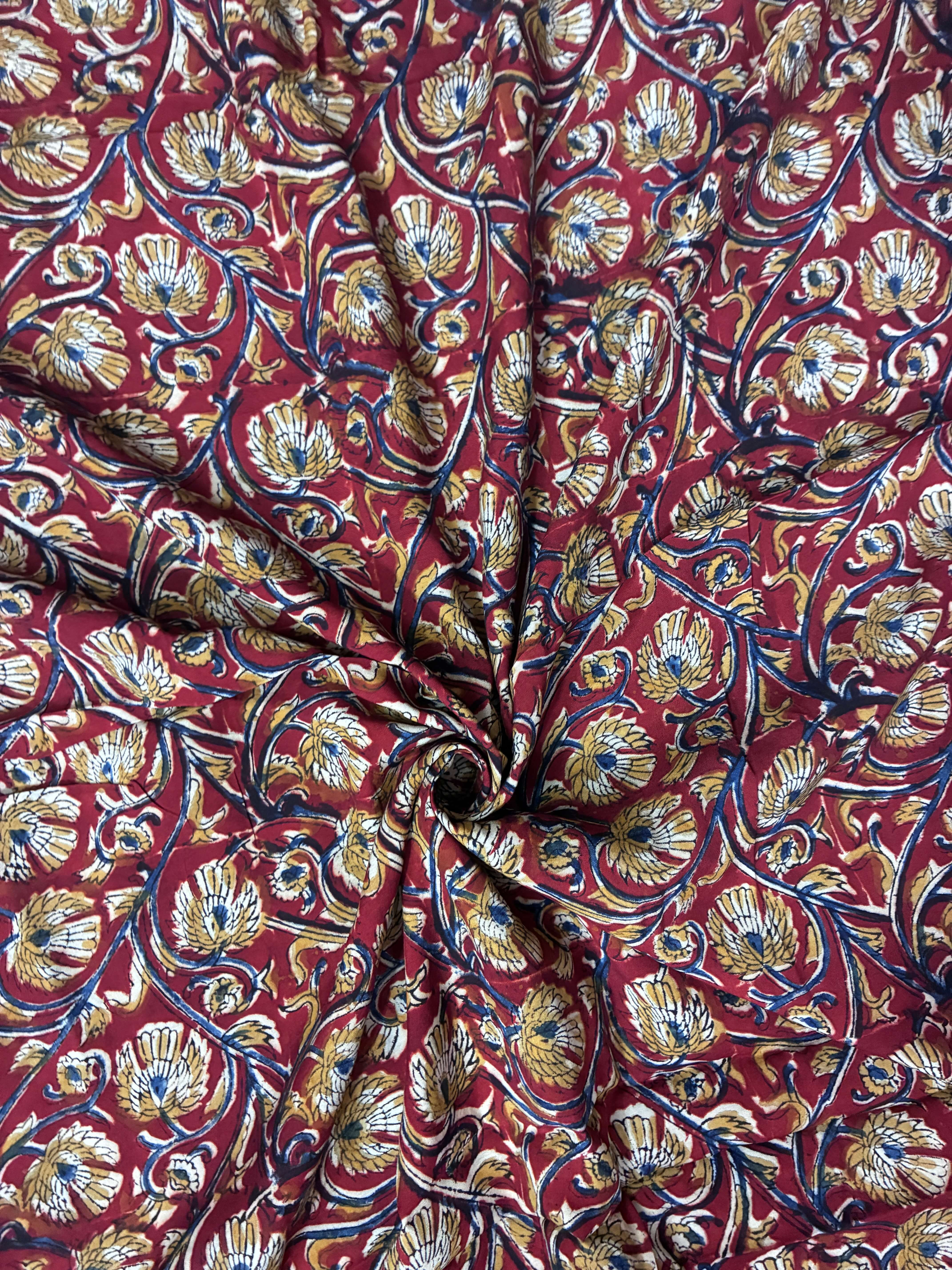 Kalamkari fabric is a traditional Indian textile celebrated for its intricate hand-painted or block-printed designs. This versatile fabric is ideal for creating elegant fashion garments — from sarees and suits to contemporary outfits — allowing you to combine heritage with modern style.