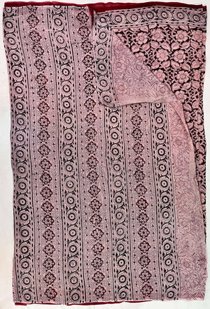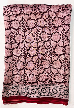 Made from our lightweight cotton blend featuring Chanderi Silk , this exquisite saree showcases traditional Kalamkari hand block prints using natural dyes.