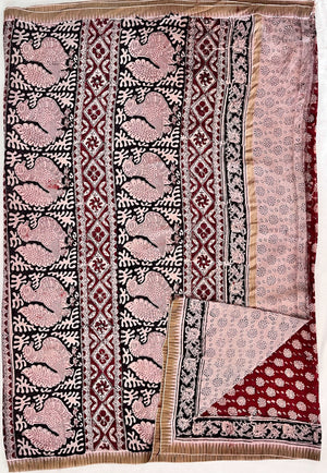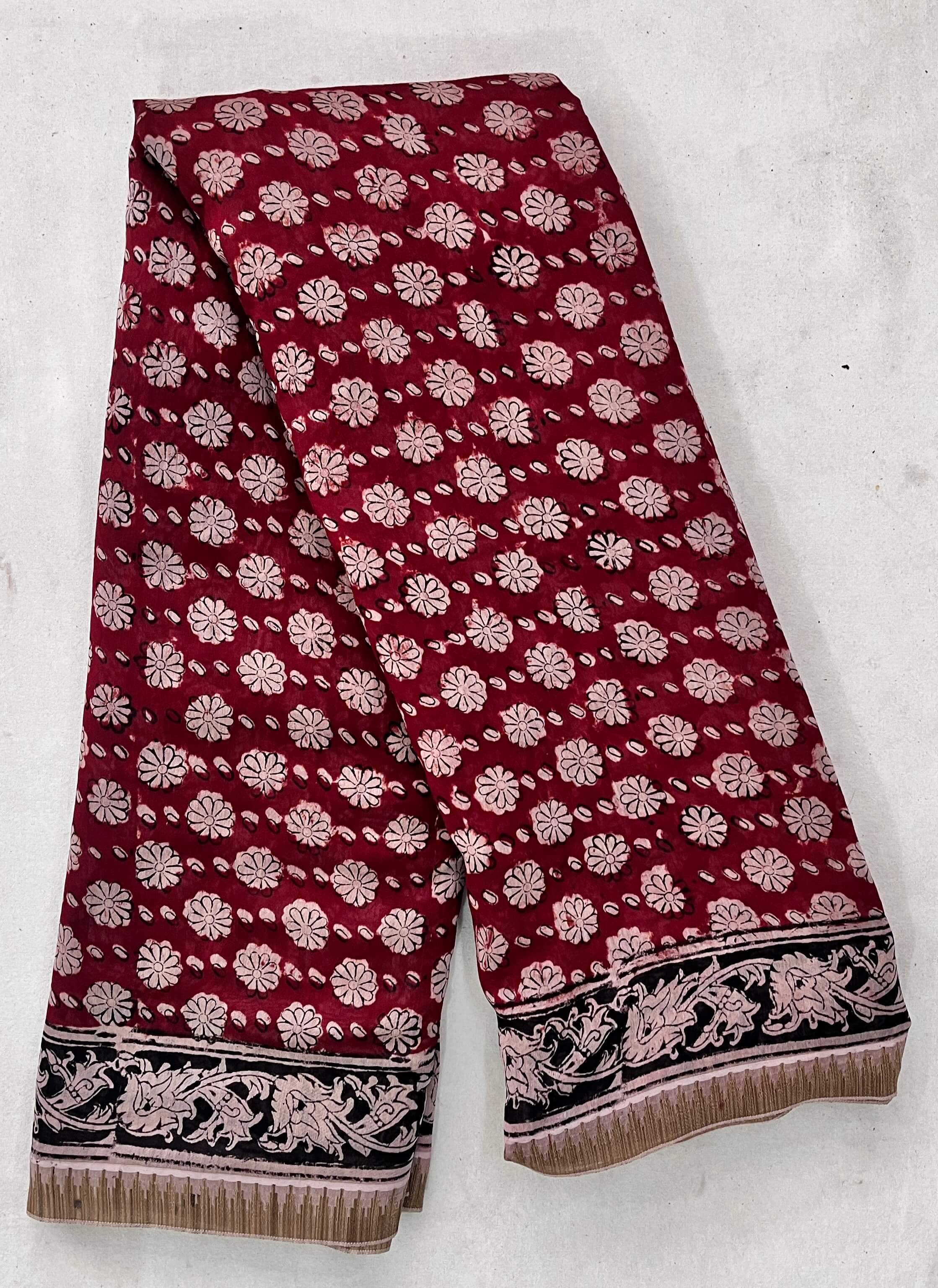 Made from our lightweight cotton blend featuring Chanderi Silk , this exquisite saree showcases traditional Kalamkari hand block prints using natural dyes.