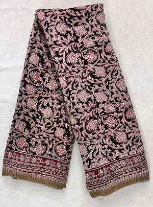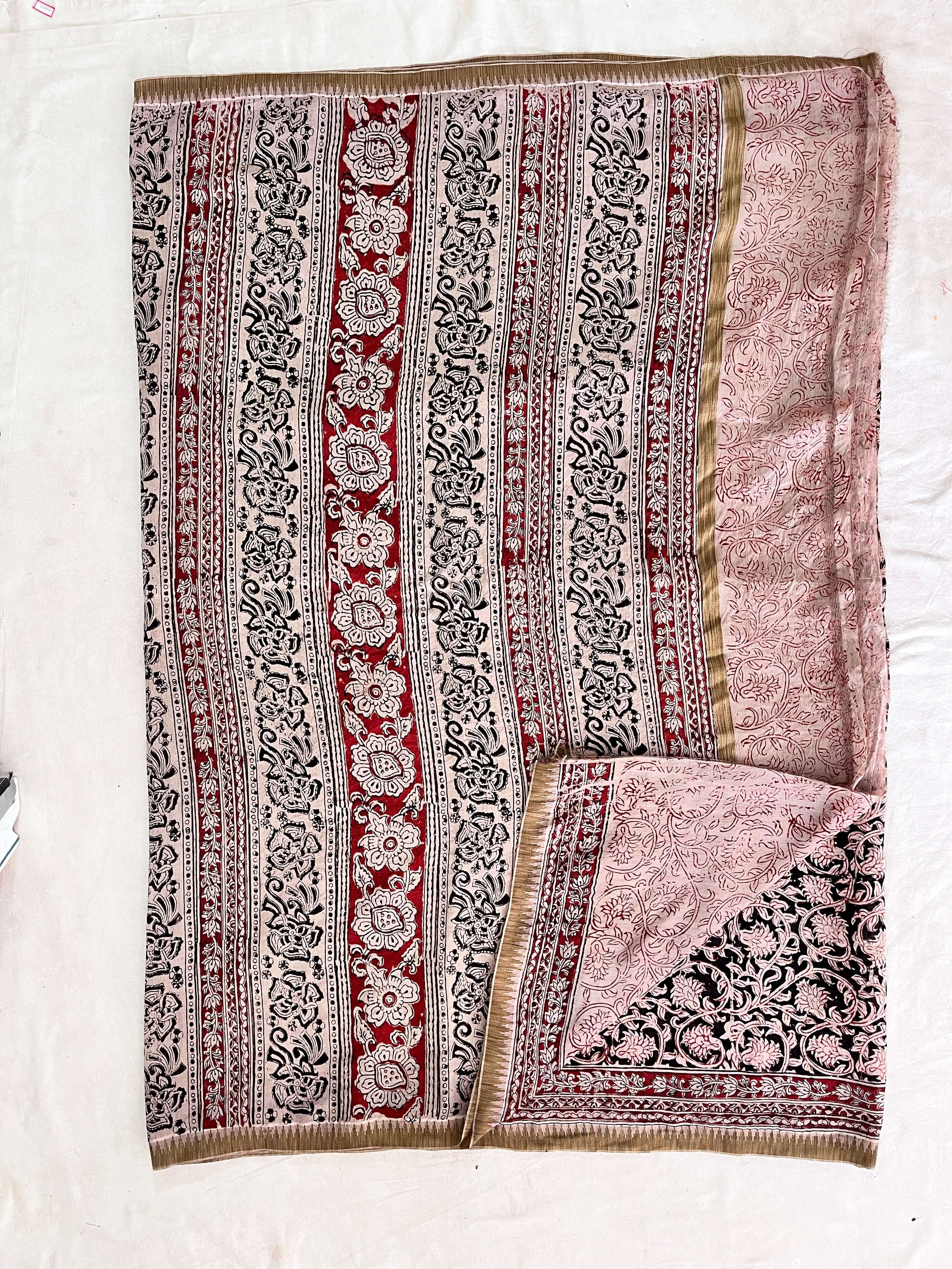 Made from our lightweight cotton blend featuring Chanderi Silk , this exquisite saree showcases traditional Kalamkari hand block prints using natural dyes.