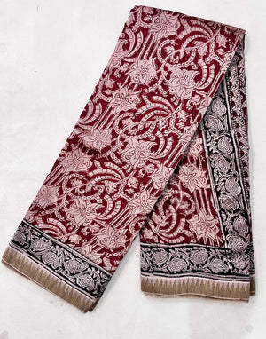 Made from our lightweight cotton blend featuring Chanderi Silk , this exquisite saree showcases traditional Kalamkari hand block prints using natural dyes.