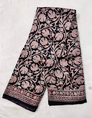 Made from our lightweight cotton blend featuring Chanderi Silk , this exquisite saree showcases traditional Kalamkari hand block prints using natural dyes.