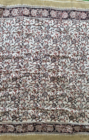 Made from our lightweight cotton blend featuring Chanderi Silk , this exquisite saree showcases traditional Kalamkari hand block prints using natural dyes.