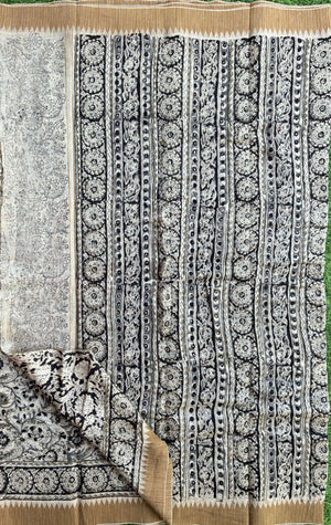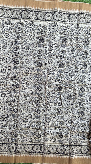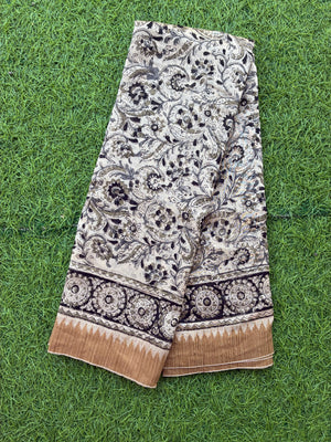 Made from our lightweight cotton blend featuring Chanderi Silk , this exquisite saree showcases traditional Kalamkari hand block prints using natural dyes.